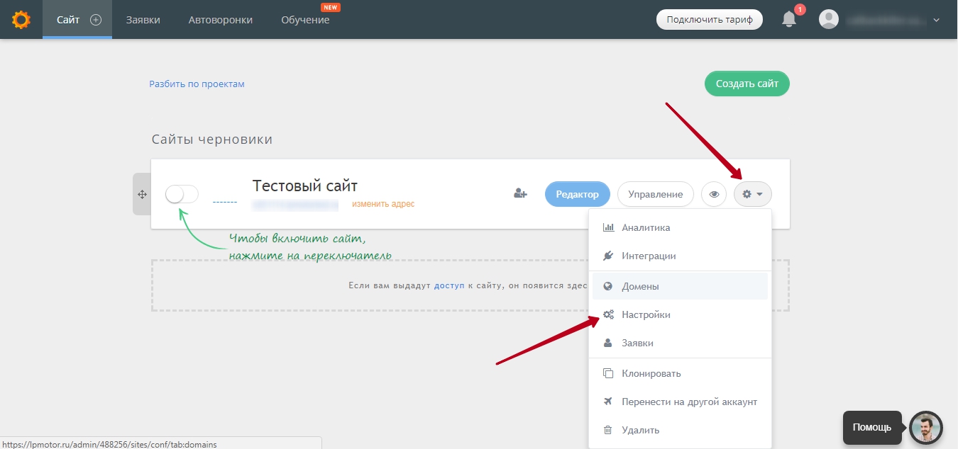 Справа от названия сайта нажмите шестеренку «Действия» и в выпадающем меню выберите пункт «Настройки».