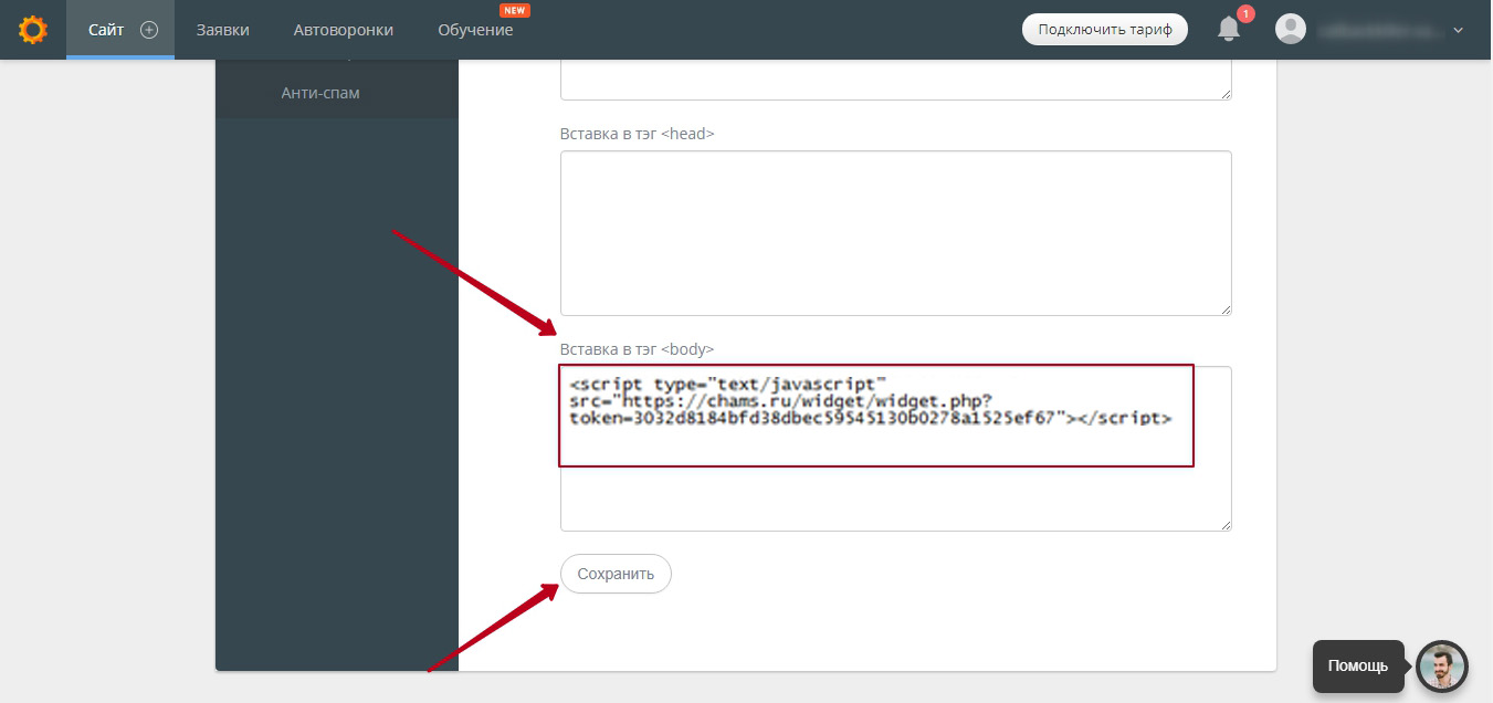 В самом низу настроек найдите блок «Вставка в тег» и вставьте код нашего сервиса. Нажмите кнопку «Сохранить».