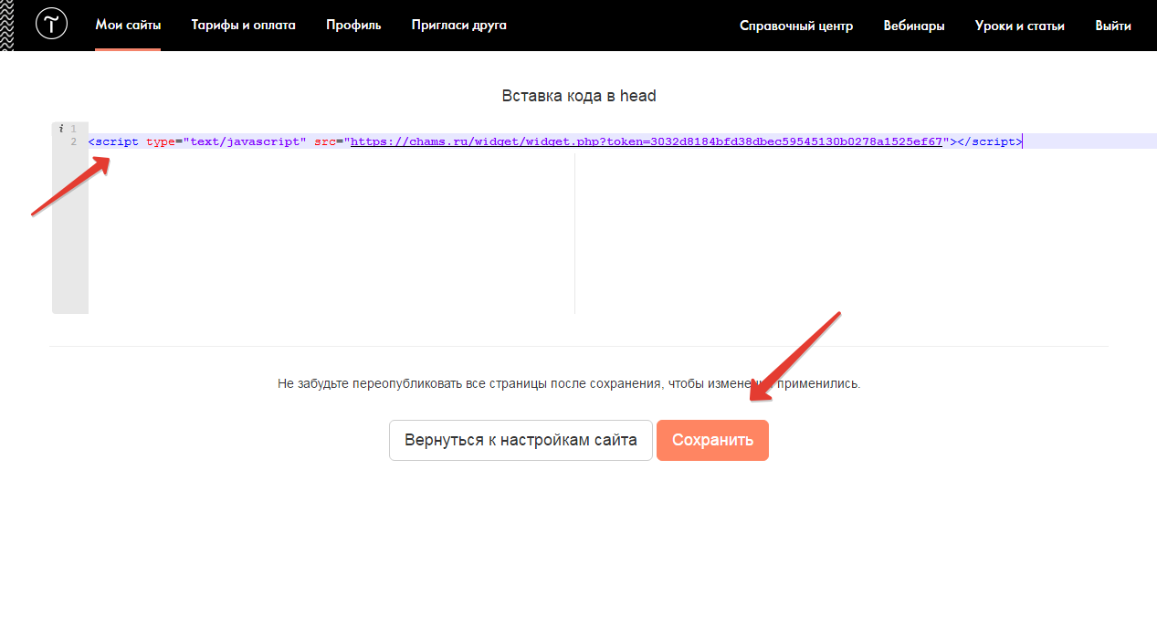 Вставляем скопированный код нашего сервиса и нажимаем на кнопку «Сохранить»
